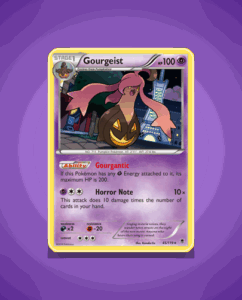 Gourgeist from the Phantom Forces set is a Rare Holo card numbered 45 with 100 HP. It features the intriguing ability Gourgantic and the attack Horror Note. This card offers a distinctive addition for collectors seeking unique Pokémon TCG pieces.