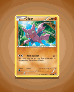 Gligar from the Phantom Forces set is a common card numbered 46. It features a lively 60 HP and the attack Rock Cannon. This straightforward design makes it a notable addition for collectors seeking classic Pokémon TCG elements.