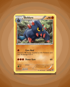 Boldore is an Uncommon Pokémon card from the Phantom Forces set, numbered 49. It features a sturdy 90 HP and a single attack called Power Gem. This card offers a straightforward but solid addition to any collection.