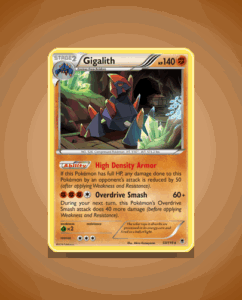 Gigalith from the Phantom Forces set is a Rare Holo card boasting a solid 140 HP. It features the ability High Density Armor and the powerful attack Overdrive Smash. This card stands out with its robust design and strategic potential.