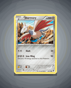 Skarmory from the Phantom Forces set is a common card numbered 59. This sleek Pokémon boasts 100 HP and features the attack Iron Wing. Its design captures a metallic elegance that fits well within the set’s theme.
