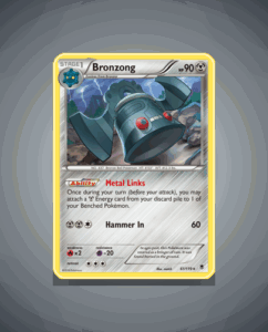 Bronzong is a rare Pokémon card from the Phantom Forces set, numbered 61. It features 90 HP and the distinctive ability Metal Links. Its attack, Hammer In, adds a strategic edge to gameplay. This card combines solid defense with tactical potential.