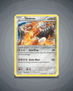 Heatran from the Phantom Forces set is a Rare Holo card numbered 63. It boasts a solid 130 HP and features the dynamic attack Steam Blast. This striking card captures Heatran’s fiery essence with vivid artwork.