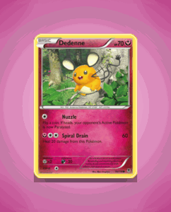 Dedenne from the Phantom Forces set is a common card numbered 70 with 70 HP. It features the attack Spiral Drain, adding a strategic element to gameplay. This compact card fits well in many decks due to its straightforward design.