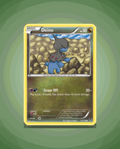 Deino from the Phantom Forces set is a common card numbered 72 with 50 HP. It features the attack Gnaw Off, offering a straightforward battle option. This card’s modest stats make it a simple yet charming addition to any collection.