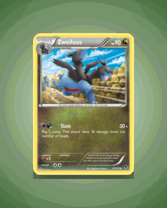 Zweilous from the Phantom Forces set is an Uncommon card with 90 HP. It features the robust attack Slam, adding a straightforward option to your deck. This card is numbered 73 in the set, making it a notable pick for collectors.