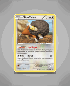 Bouffalant from the Primal Clash set is an uncommon Pokémon card with 110 HP. It features the ability Sap Sipper and the attack Derail. This sturdy card is number 119 in the set.