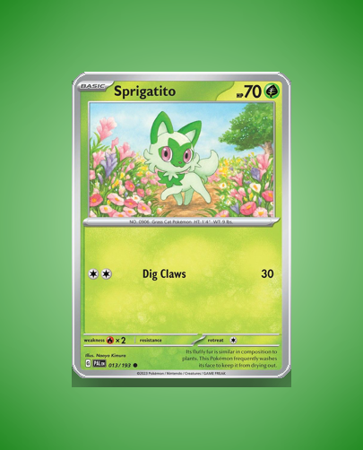 Sprigatito, the Grass Cat Pokémon, debuts in the Paldea Evolved set as common card #13. With 70 HP and a signature move Dig Claws, this feline is ready to pounce on your strategy. Its ability remains undisclosed, leaving collectors eager for more information.