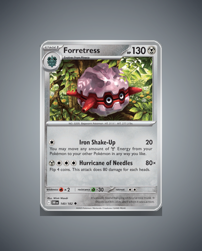 - Destined Rivals (sv10): Forretress appears as a solid Metal-type Stage 1 with energy manipulation and high-damage potential attacks. It fits well into Metal-themed decks but is currently not legal for tournament play.