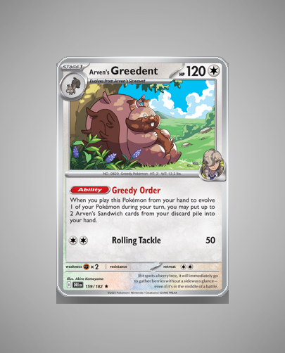 This guide focuses on the exact printing of Arven’s Greedent from the Destined Rivals set (sv10-159). It is a rare card illustrated by Akira Komayama, featuring the ability “Greedy Order” and the attack “Rolling Tackle” which deals 50 damage.