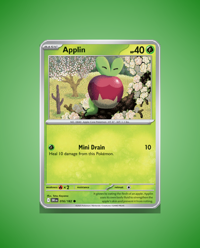 - Destined Rivals (sv10): Applin is introduced as a Basic Grass-type Pokémon with a unique healing attack, fitting the set’s theme of rival Pokémon and their evolving dynamics. This set emphasizes fresh Scarlet & Violet designs with a focus on character-driven gameplay elements.