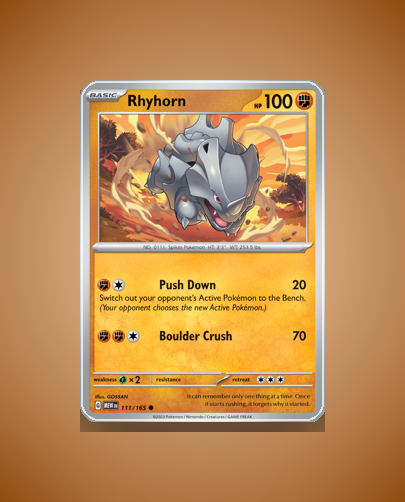 Rhyhorn is a Common Basic Fighting-type from the 151 set, card #111. With 100 HP and the attack Boulder Crush, it offers a straightforward, classic option for collectors. It also includes Push Down, adding a bit of tactical disruption.