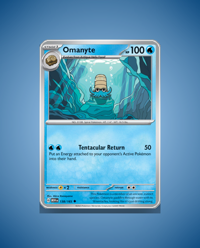 Omanyte from the 151 set is an uncommon card boasting 100 HP with the distinctive attack Tentacular Return. It holds a unique place as number 138 in the collection.