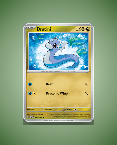 - 151 (Scarlet & Violet series): Includes Dratini as a Basic Dragon-type Pokémon with straightforward attacks and a charming flavor text highlighting its growth process. The set focuses on a fresh take with new artwork and energy combinations.