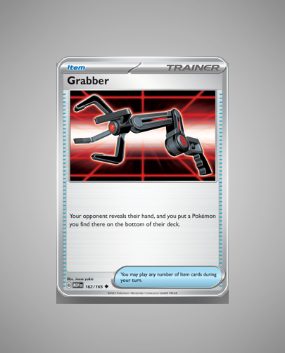 - 151 (Scarlet & Violet): Grabber debuts as an uncommon Item card with a strategic hand disruption effect. It is part of a set featuring a variety of new mechanics and artwork styles, marked by regulation G.