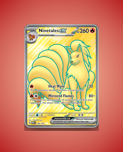 - 151 (Scarlet & Violet): Features Ninetales ex as an Ultra Rare Stage 1, ex card with powerful Fire-type attacks and a high HP of 260. The set emphasizes strong Pokémon ex cards with unique artwork by PLANETA Tsuji.