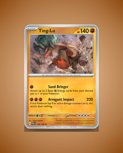 Ting-Lu is a Rare card from the Paradox Rift set, numbered 109. With 140 HP and the striking attack Arrogant Impact, it offers a solid presence for collectors seeking distinctive Pokémon from the set.