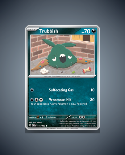 - Paradox Rift (sv4): Introduces Trubbish as a Basic Darkness-type Pokémon with straightforward attacks and a unique flavor text highlighting its unsanitary habitat. This set expands the Scarlet & Violet series with a focus on Paradox Pokémon themes.