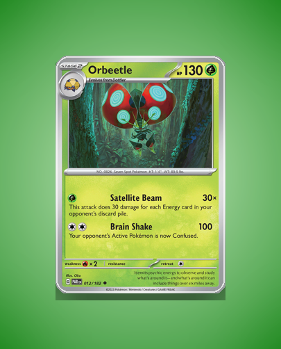 - Paradox Rift: This set includes Orbeetle as a Stage 2 Grass-type Pokémon with versatile attacks and a distinctive psychic-themed flavor text. The set’s focus on paradoxical and mysterious Pokémon is reflected in Orbeetle’s design and abilities.