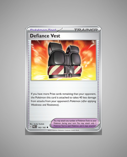 • Paradox Rift (sv4): Defiance Vest debuts as a defensive Pokémon Tool card with a unique damage reduction effect, illustrated by Ayaka Yoshida. It holds a niche role in gameplay and is a collectible piece within the Scarlet & Violet series.