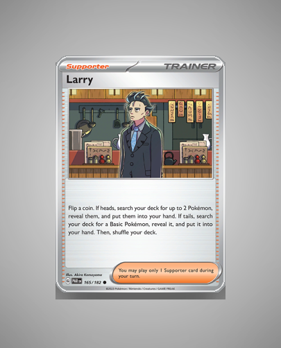 - Effect: Larry’s effect involves flipping a coin to search your deck for Pokémon—either up to two or one Basic Pokémon—then adding them to your hand.