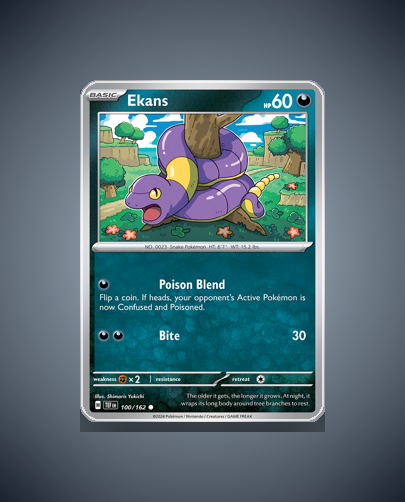 This guide covers the exact printing of Ekans from the Scarlet & Violet “Temporal Forces” set, card number 100. It features two attacks: “Poison Blend,” which can confuse and poison the opponent’s Active Pokémon on a coin flip, and “Bite,” dealing 30 damage for two Darkness energy.
