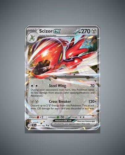 Scizor ex (Temporal Forces, 111) is a standout Double Rare with 270 HP and the signature attack Cross Breaker. Its sturdy, aggressive design makes it a notable pickup for collectors.