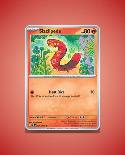 Sizzlipede from the Temporal Forces set is a Common Pokémon card with 80 HP. It features the fiery attack Heat Dive, adding a dynamic edge to battles. This card is numbered 36 in the set, making it a notable addition for collectors.