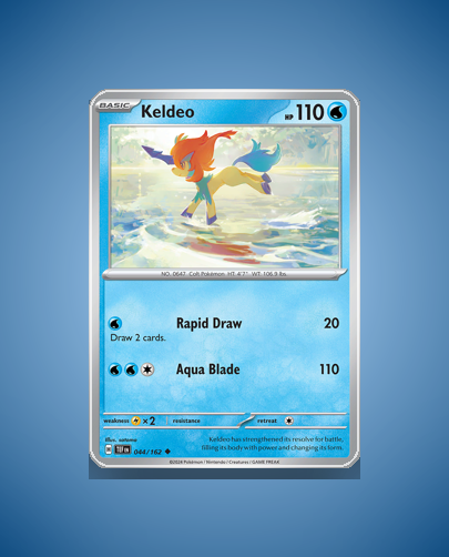 - Temporal Forces (sv5): Keldeo appears as a Basic Water-type Pokémon emphasizing quick card draw and strong Water attacks. The artwork by satoma captures Keldeo’s energized state. The card’s regulation mark is H, and the release date remains unknown.