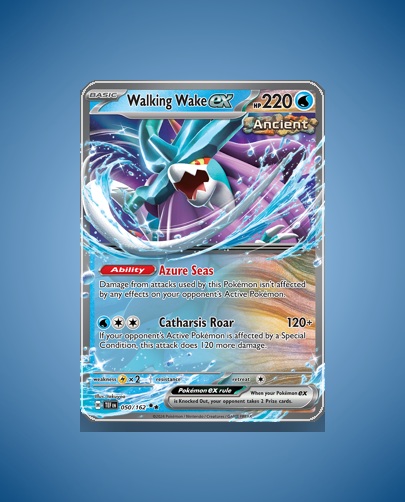 • Temporal Forces (sv5): Walking Wake ex appears as a Water-type Basic ex with Azure Seas and a high-damage Catharsis Roar, adding strategic depth and collectible appeal to the set.