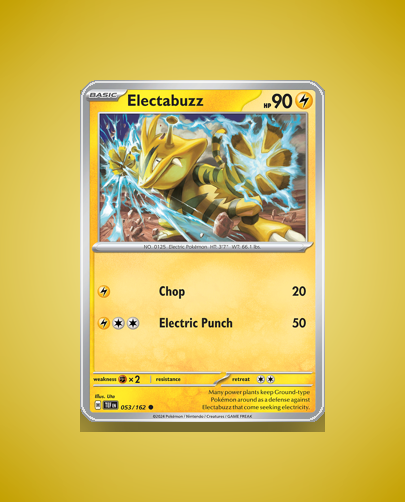 Electabuzz from the Temporal Forces set is a common card numbered 53. This energetic Pokémon boasts 90 HP and features the attack Electric Punch. Its straightforward design makes it a solid addition to any collection.