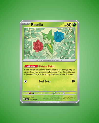 • Temporal Forces (sv5): Roselia is introduced as a Common Basic Grass-type Pokémon with a unique Poison Point ability and a simple Leaf Step attack. This set emphasizes strategic abilities and flavorful artwork, with Roselia’s relaxing floral theme standing out.