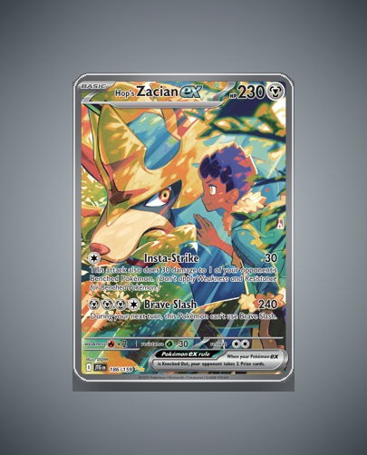 Hop’s Zacian ex from the Journey Together set is a Special Illustration Rare card numbered 186. With 230 HP and the powerful Brave Slash attack, its dynamic artwork makes it a standout for collectors.