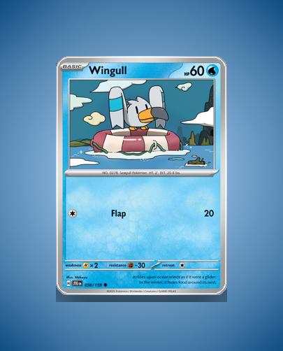 - Journey Together (sv9): This set features Wingull as a Basic Water-type Pokémon with simple, straightforward gameplay. The card’s art and flavor text emphasize Wingull’s natural habits and oceanic environment, fitting the set’s thematic focus on Pokémon journeys and companionship.