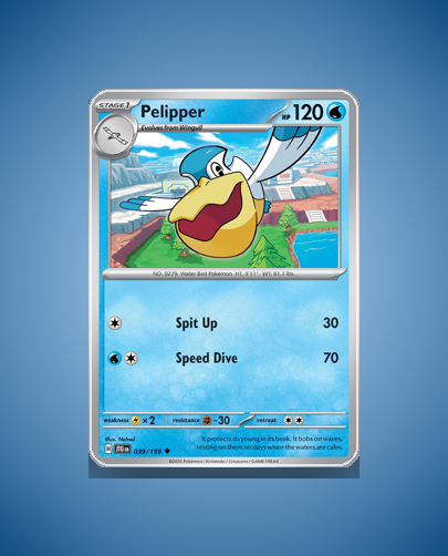 - Journey Together (sv9): Pelipper appears as a reliable Stage 1 Water-type with solid HP and straightforward attacks. This set focuses on a variety of Pokémon from the Scarlet & Violet series, with Pelipper contributing a balanced option for collectors and casual players alike.