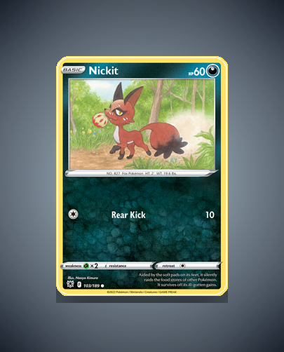 Nickit from the Astral Radiance set is a Common Pokémon card numbered 103. Featuring 60 HP and a single attack, Rear Kick, its straightforward design makes it a charming addition to any collection.
