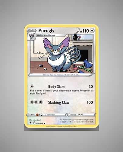 - Astral Radiance: This set features Purugly as a Stage 1 Colorless-type Pokémon with a balanced HP of 110 and two attacks that offer both status effects and high damage potential. The set’s artwork style is represented well by Mina Nakai’s illustration of Purugly, emphasizing its intimidating yet sleek design.
