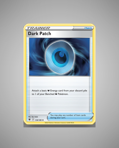 Play effect: Dark Patch allows you to attach a basic Darkness Energy card from your discard pile to one of your Benched Darkness Pokémon. Additionally, you may play any number of Item cards during your turn, making it a flexible and strategic choice in deck building.