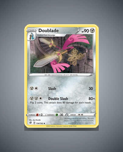 • Rebel Clash (swsh2): Features Doublade as a Stage 1 Metal-type Pokémon with solid HP and versatile attacks. This set highlights the evolving line from Honedge with detailed artwork and balanced gameplay mechanics.