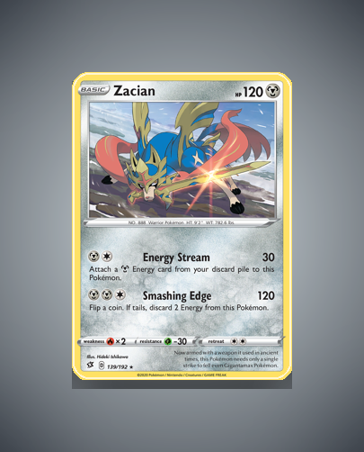 Zacian from the Rebel Clash set is a rare Pokémon card numbered 139. It boasts 120 HP and features the striking attack Smashing Edge. This card offers a solid presence for collectors and players alike.