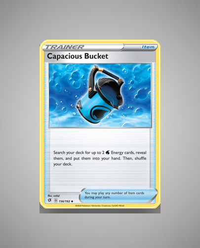 Capacious Bucket is an Uncommon Item card from the Rebel Clash set, numbered 156. Featuring a practical, utility-focused design, it’s a notable pick for collectors who appreciate gameplay-enabling tools.