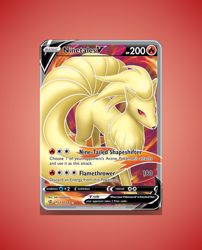 This card is not currently legal in Standard, Expanded, or Unlimited formats. It features the standard V rule, where knocking out a Pokémon V grants the opponent two Prize cards. Its attacks include “Nine-Tailed Shapeshifter,” which copies an opponent’s attack, and “Flamethrower,” a powerful 180-damage move that requires discarding an Energy.