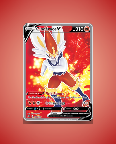 - Rebel Clash: Features Cinderace V as a Fire-type Basic Pokémon with a strong attack and a useful ability that removes its retreat cost when a Stadium is in play. As a Rare Ultra with high HP and aggressive damage output, it stands out in the set.