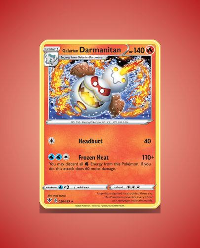 Galarian Darmanitan from the Darkness Ablaze set is a Rare card numbered 28. This striking Pokémon boasts 140 HP and features the powerful attack Frozen Heat. Its bold presence makes it a notable addition to any collection.