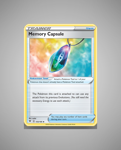 - Vivid Voltage (swsh4): Memory Capsule debuts as a strategic Pokémon Tool that enhances the versatility of your Pokémon by enabling access to attacks from previous Evolutions. Its unique ability makes it a notable addition to the Sword & Shield series.