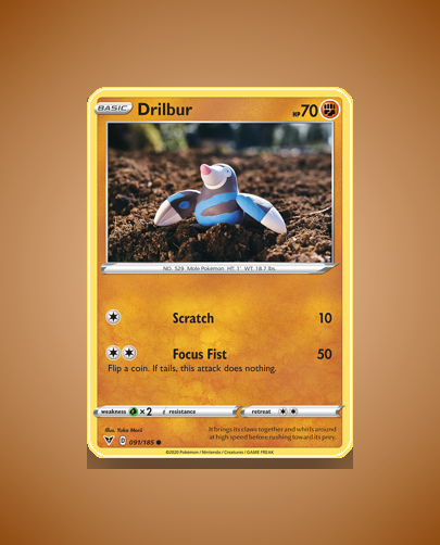 Drilbur from the Vivid Voltage set is a Common card numbered 91. It features 70 HP and the attack Focus Fist. This straightforward design makes it a practical choice for collectors seeking solid basics.