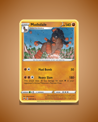 - Vivid Voltage (swsh4): Mudsdale #97 is a robust Fighting-type Stage 1 Pokémon with high HP and straightforward damage output. Its retreat cost of 3 calls for mindful energy management.