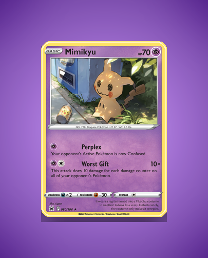 Mimikyu is a Rare Pokémon card from the Lost Origin set, numbered 80. It has 70 HP and features the attack Worst Gift. This card offers a unique addition to any collection with its distinct design.
