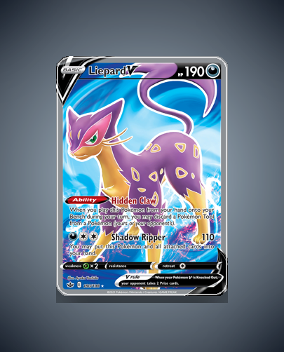 - Chilling Reign (swsh6): Liepard V appears as a Rare Ultra card with a powerful ability and attack, fitting the set’s theme of chilling and mysterious Pokémon. It is a Basic Darkness-type Pokémon with a strong HP pool and strategic utility in discarding Pokémon Tools. The card’s release date remains unknown.
