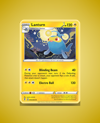 This exact printing of Lanturn appears in the Sword & Shield series set Evolving Skies with the set code swsh7-53. It features two attacks: Blinding Beam, which can disrupt an opponent’s attack by forcing a coin flip, and Electro Ball, a high-damage move costing three energy. The card’s flavor text highlights Lanturn’s blinding light tactic.